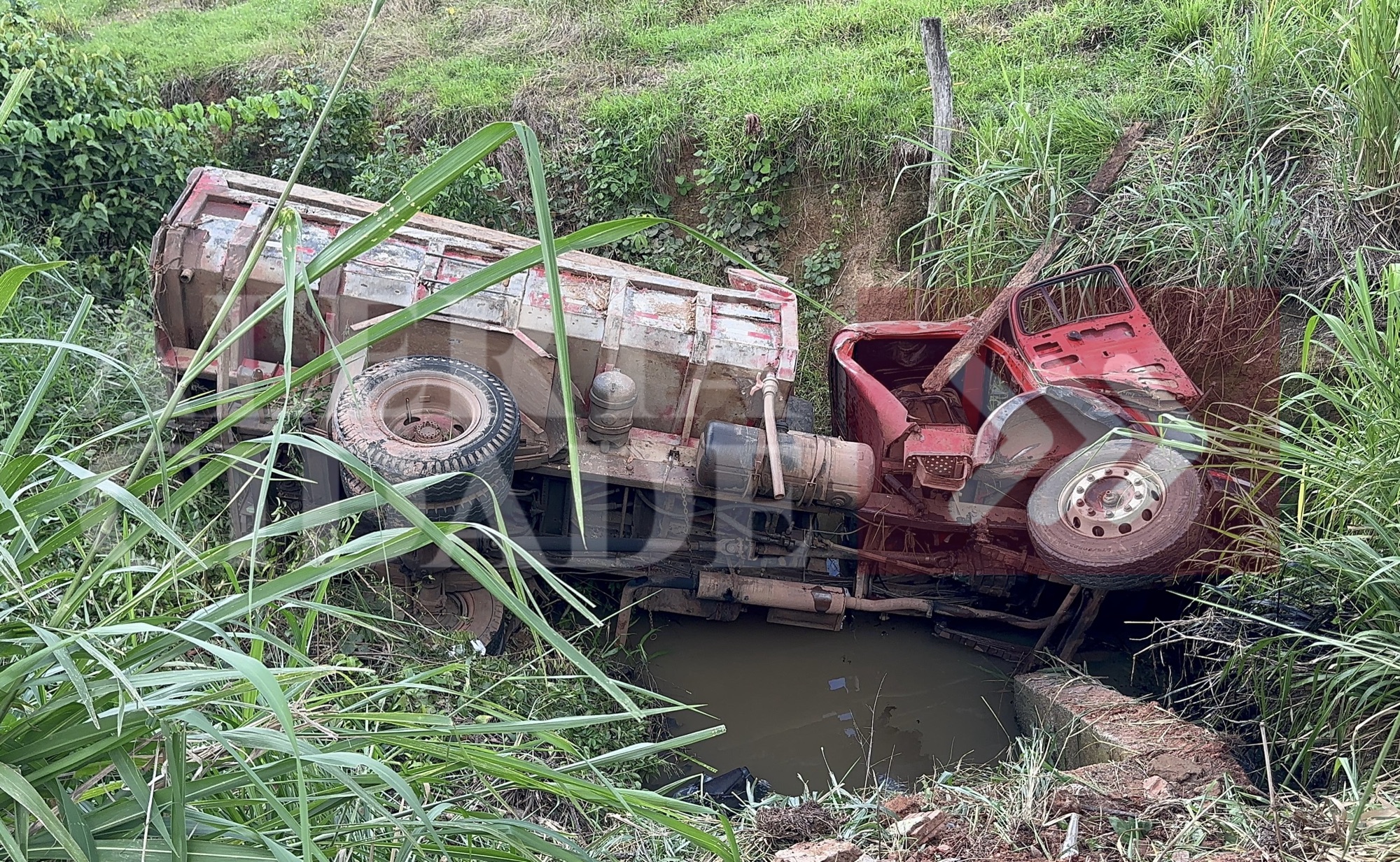 Barra de direção de caçamba quebra, e veículo cai dentro de Igarapé, deixando o motorista ferido 24 de janeiro de 2024
