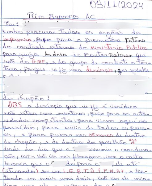 “Peço para as autoridades competentes, para virem aqui no presídio, para ouvir de todos os presos, para puxar nas câmeras de segurança do Chapão, de dentro do pavilhão ‘Q’. Desde do dia que mudou a coordenação, vocês vão ver ver nas filmagens, com a carta branca que foi dada, ele (servidor) atirando em uma pessoa LGBTQIAPN+, e ele batendo em mais uns dois. Vão ver ele invadindo a cela e espancando um preso, que é irmão de um policial.” Diz trecho da denúncia.